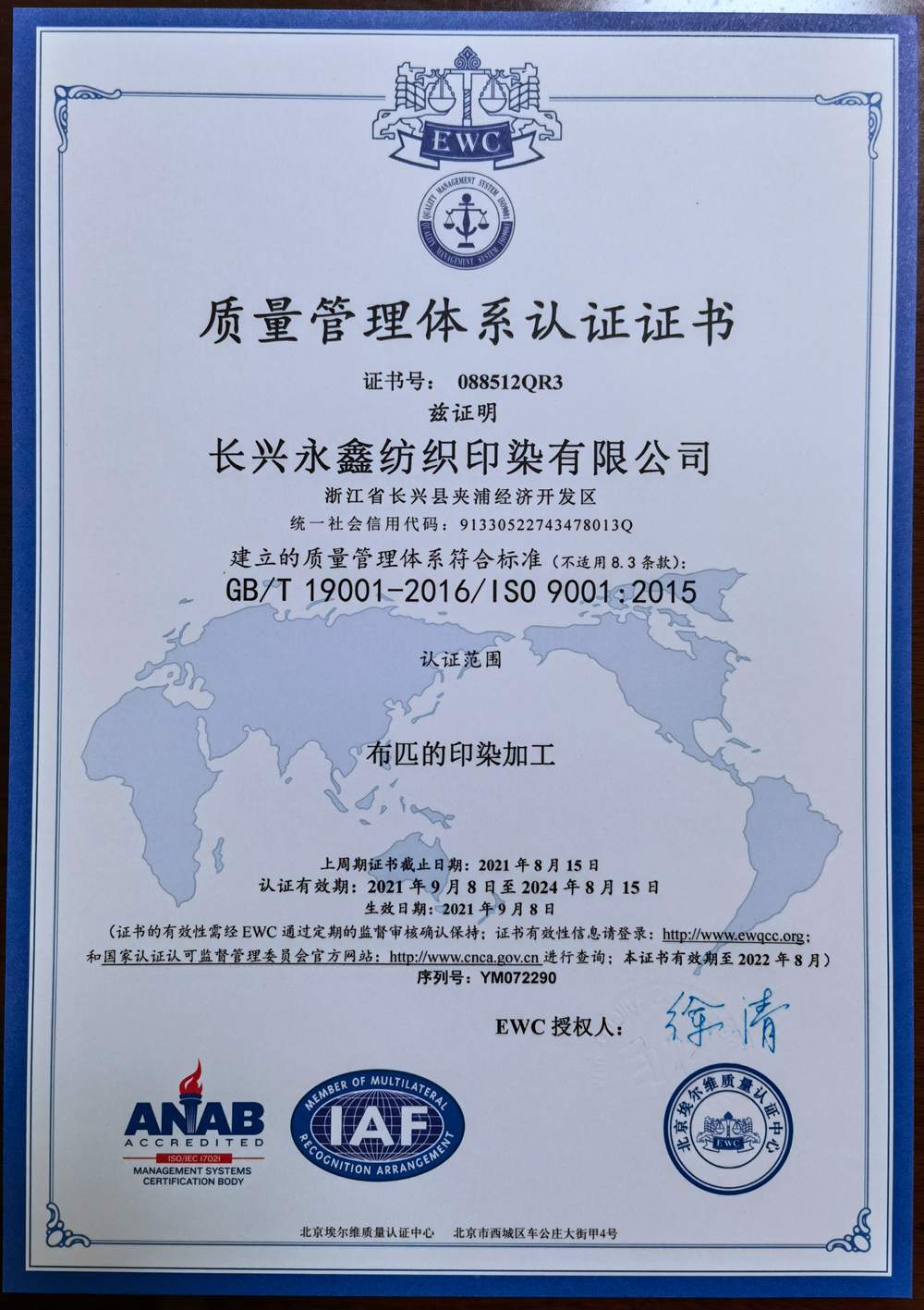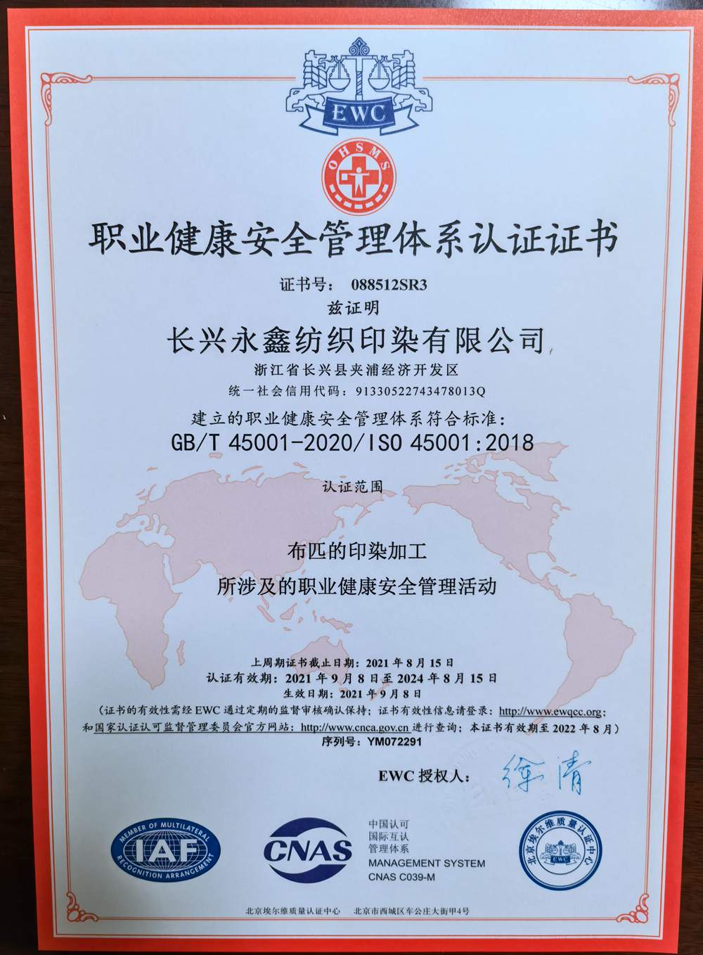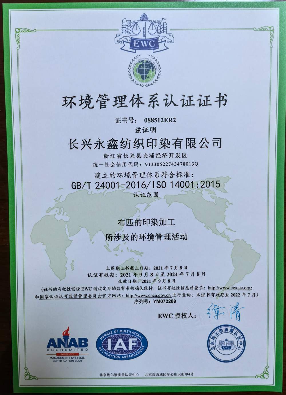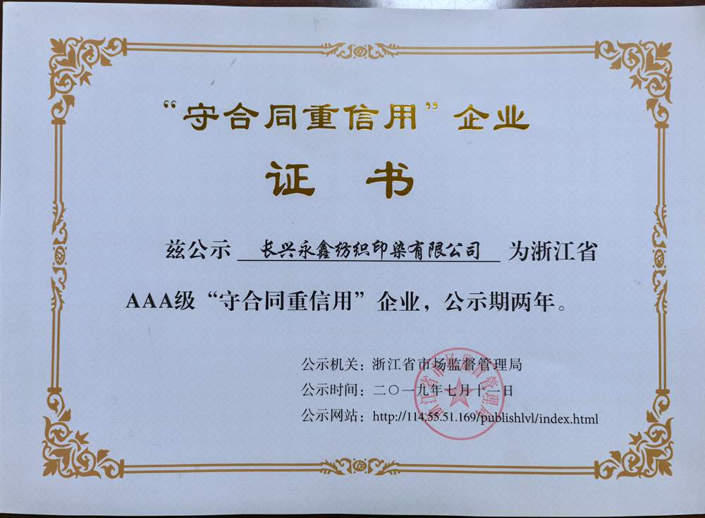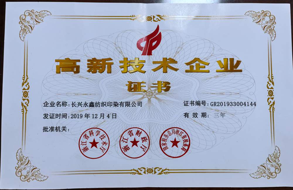 长兴永鑫纺织印染有限公司是一家集纺织,印花,染色为主的企业。座落于美丽的太湖之滨-浙江长兴夹浦镇工业园区鑫光路6号。地处长三角杭嘉湖平原,104、318国道和杭宁、沪皖高速公路在此交汇,三省交界,素有浙江北大门之称。地理位置,环境得天独厚,交通十分便捷。